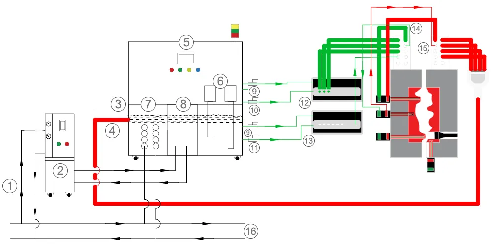 Each pipeline is equipped with a flow monitoring system, allowing real-time display of water flow in the HMI. Alarm ranges can be set, and when flow is below the lower limit or above the upper limit, the unit triggers an alarm and can output alarm signals to the die casting machine.